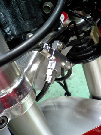 ノーマルブレーキホースが通っていたステーを外し、そこに分岐アダプターを利用して、マスター側のホースを一本に収める。