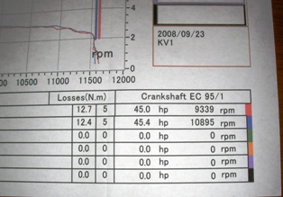 45.4hp/10895rpm, 3.6mkg/8678rpm, とまあ、ほぼカタログスペック。